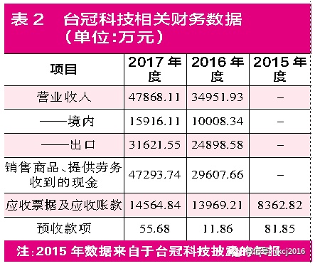同样,2017年该公司营业收入也存在不小的问题。根据披露的数据,2017年台冠科技实现营业收入47868.11万元,其中包含31621.55万元的出口金额,照此计算,2017年包含其内销增值税的含税营业收入总额应该为50630.03万元。
